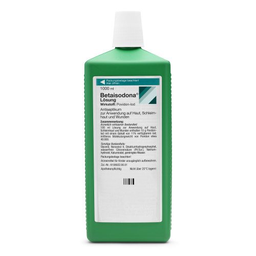 Betaisodona® Lösung 100 mg/ml Lösung zur Anwendung auf der Haut Wirkstoff: Povidon-Iod. Anwendungsgebiete: Betaisodona® Lösung ist ein keimtötendes Mittel (Antiseptikum) zur Anwendung auf Haut, Schleimhaut und Wunden. Betaisodona® Lösung wird einmalig angewendet zur Desinfektion der intakten äußeren Haut oder Antiseptik der Schleimhaut wie z. B. vor Operationen, Biopsien, Injektionen, Punktionen, Blutentnahmen und Blasenkatheterisierungen. Betaisodona® Lösung wird wiederholt, zeitlich begrenzt angewendet zur antiseptischen Wundbehandlung (z. B. Druckgeschwüre, Unterschenkelgeschwüre), bei Verbrennungen, infizierten und superinfizierten Hauterkrankungen sowie zur chirurgischen Händedesinfektion. Zu Risiken und Nebenwirkungen lesen Sie die Packungsbeilage und fragen Sie Ihre Ärztin, Ihren Arzt oder in Ihrer Apotheke. Stand 07/2025