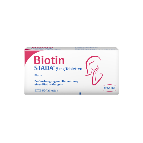 Biotin STADA® 5 mg Tabletten Wirkstoff: Biotin. Zur Vorbeugung und Behandlung eines Biotin-Mangels. (Zur Vorbeugung sind weniger als 0,2 mg Biotin am Tag ausreichend.). Behandlung eines Biotin-Mangels beim sehr seltenen Biotin-abhängigen, multiplen Carboxylasemangel. Hinweis: Enthält Lactose. Zu Risiken und Nebenwirkungen lesen Sie die Packungsbeilage und fragen Sie Ihre Ärztin, Ihren Arzt oder in Ihrer Apotheke. Zulassungsinhaber: STADAPHARM GmbH, Stadastraße 2-18, 61118 Bad Vilbel Vertrieb: STADA Consumer Health Deutschland GmbH, Stadastraße 2-18, 61118 Bad Vilbel Stand: Juli 2020