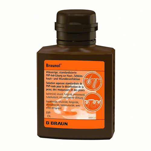 Braunol® unverdünnt auftragen und mit einem Tupfer verreiben. Zu behandelnde Hautpartien vollständig benetzen. Bei der präoperativen Hautdesinfektion „Pfützenbildung“ unter dem Patienten wegen möglicher Hautreizungen vermeiden.