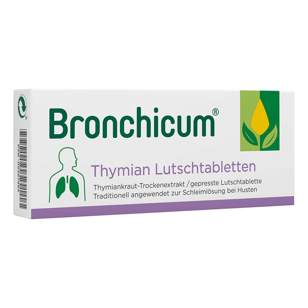 Bronchicum® Thymian Lutschtabletten. Wirkstoff: Thymiankraut-Trockenextrakt. Anwendungsgebiete: Traditionell angewendet zur Unterstützung der Schleimlösung bei Husten im Rahmen von Erkältungen. Hinweis: Traditionelles pflanzliches Arzneimittel zur Anwendung bei: „Zur Unterstützung der Schleimlösung bei Husten im Rahmen von Erkältungen“, ausschließlich auf Grund langjähriger Anwendung. Zu Risiken und Nebenwirkungen lesen Sie die Packungsbeilage und fragen Sie Ihre Ärztin, Ihren Arzt oder in Ihrer Apotheke