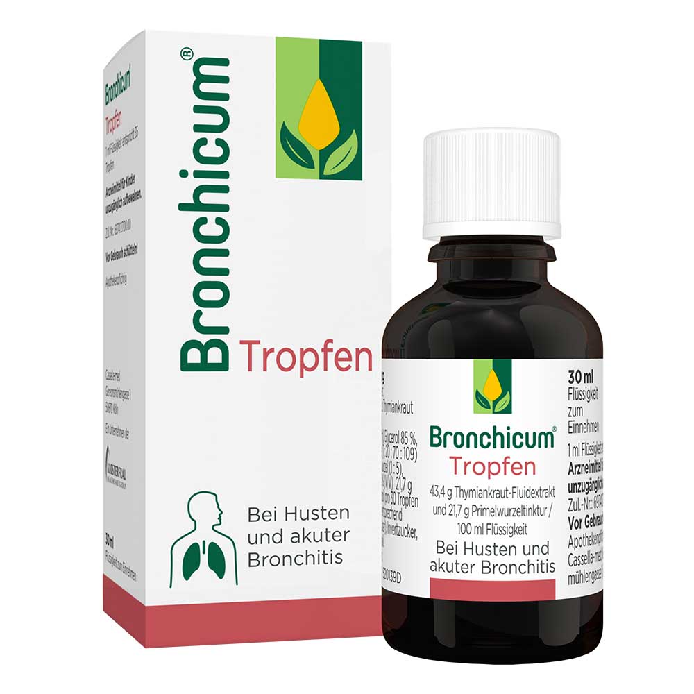 Bronchicum® Tropfen. Anwendungsgebiete: Behandlung der Symptome einer akuten Bronchitis und Erkältungskrankheiten der Atemwege mit zähflüssigem Schleim. Warnhinweise: Enthält 27,7 Vol.-% Alkohol, Sucrose (Zucker), Invertzucker, Eukalyptusöl, Levomenthol. Packungsbeilage beachten. Zu Risiken und Nebenwirkungen lesen Sie die Packungsbeilage und fragen Sie Ihre Ärztin, Ihren Arzt oder in Ihrer Apotheke.
