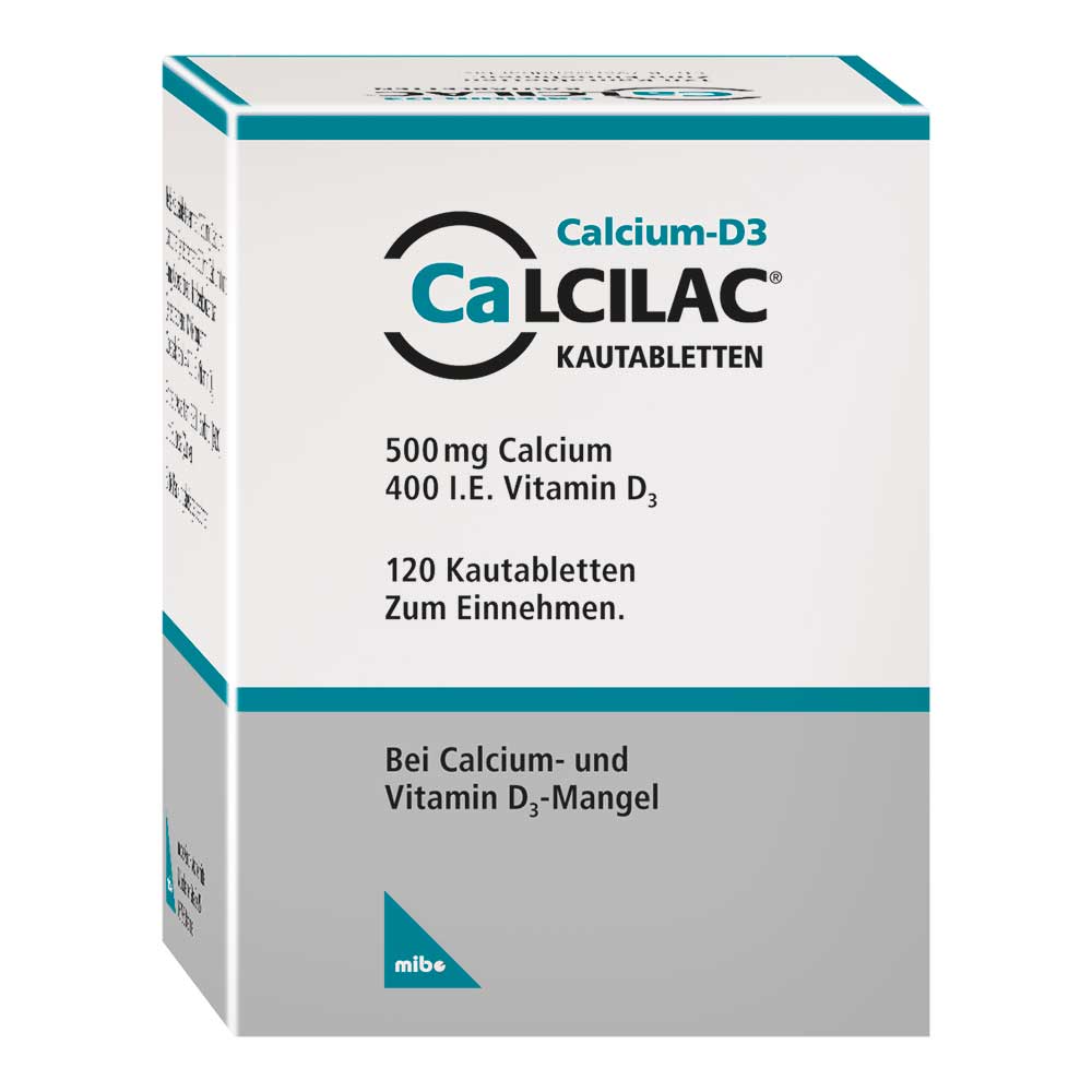 Calcilac® Kautabletten Wirkstoffe: Calciumcarbonat und Colecalciferol (Vitamin D3). Anwendungsgebiete: Prävention und Behandlung von Vitamin-D- und Calcium-Mangelzuständen bei älteren Personen; Calcium- und Vitamin-D-Ergänzung zur Unterstützung einer spezifischen Osteoporosetherapie für Patienten, bei denen das Risiko eines Vitamin-D- und Calciummangels besteht. Warnhinweis: Enthält Sorbitol, Aspartam, Saccharose. Stand 01/2023. mibe GmbH Arzneimittel, 06796 Brehna. Zu Risiken und Nebenwirkungen lesen Sie die Packungsbeilage und fragen Sie Ihre Ärztin, Ihren Arzt oder in Ihrer Apotheke.
