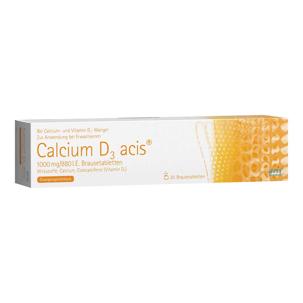 Calcium D3 acis® 1000 mg/880 I.E., Brausetabletten Wirkstoff: Calcium, Colecalciferol. Anwendungsgebiete: Zur Vorbeugung und Behandlung von Calcium- und Vitamin-D-Mangelzuständen bei älteren Menschen. Als Ergänzung zur Unterstützung einer spezifischen Osteoporosetherapie für Patienten, bei denen das Risiko eines Vitamin-D- und Calciummangels besteht. Wenn Sie sich nach einem Monat nicht besser oder gar schlechter fühlen, wenden Sie sich an Ihren Arzt. Warnhinweise: Enthält Natriumverbindungen, Lactose, Saccharose und Sojaöl. Zu Risiken und Nebenwirkungen lesen Sie die Packungsbeilage und fragen Sie Ihre Ärztin, Ihren Arzt oder in Ihrer Apotheke. Stand: 11/2025.