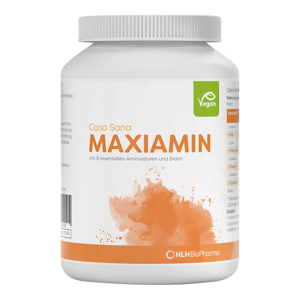 Casa Sana Maxiamin enthält alle 8 lebenswichtigen (essentiellen) Aminosäuren in rein kristalliner Form. Das Verhältnis der einzelnen Aminosäuren ist optimal aufeinander abgestimmt und entspricht dem menschlichen Aminosäure-Grundmuster. Durch die Darreichung in L-Form werden die Aminosäuren schnell und effizient vom Körper aufgenommen. Aminosäuren zählen zu den wichtigsten Bausteinen der Darmschleimhaut.