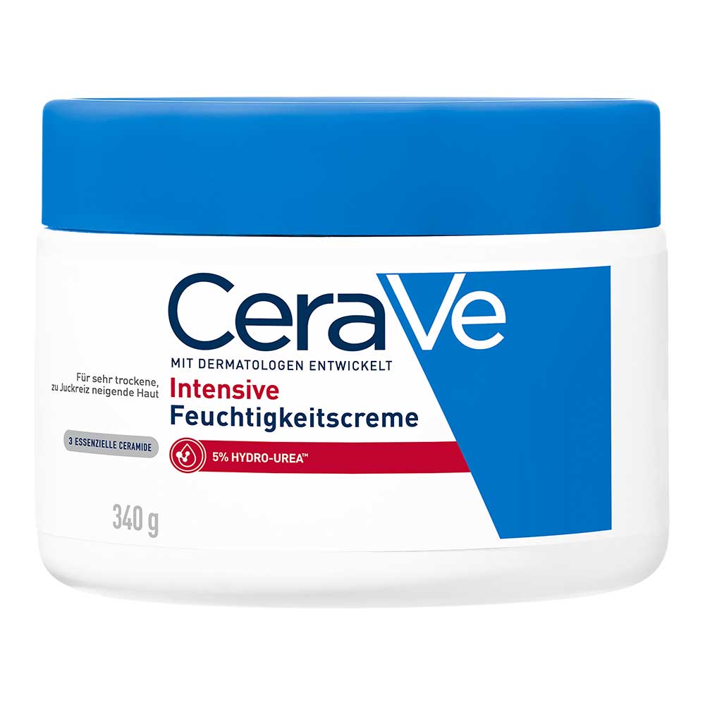 Die CeraVe Intensive Feuchtigkeitscreme mit 5 % Hydro-Urea-Komplex, Sheabutter sowie den drei essenziellen Ceramiden 1, 3 und 6-II versorgt trockene Haut bis zu 72H lang intensiv mit Feuchtigkeit und lindert sanft trockenheitsbedingten Juckreiz – für ein spürbar weicheres, angenehmeres Hautgefühl.