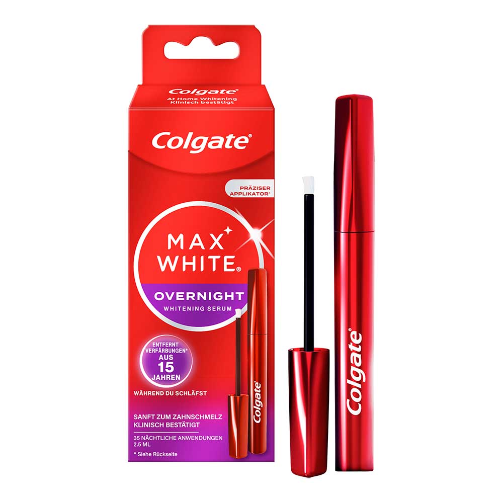 Das Colgate Max White Overnight Whitening-Serum enthält einen innovativen Whitening-Wirkstoff, der Verfärbungen aus 15 Jahren* entfernt während Sie schlafen. Dank des neuen und verbesserten präzisen Applikators ist das Auftragen einfacher denn je.