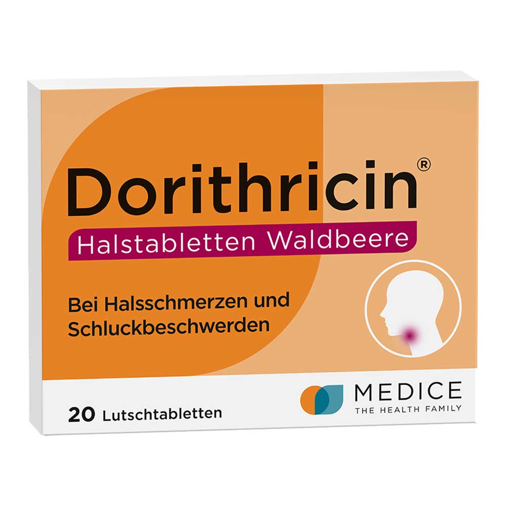 Dorithricin® Halstabletten Waldbeere. Anwendungsgebiete: Zur symptomatischen Behandlung bei Infektionen des Mund- und Rachenraumes mit Halsschmerzen und Schluckbeschwerden. Dorithricin® Waldbeere enthält Sorbitol. Zu Risiken und Nebenwirkungen lesen Sie die Packungsbeilage und fragen Sie Ihre Ärztin, Ihren Arzt oder in Ihrer Apotheke. Stand 04/2022. MEDICE Arzneimittel, 58638 Iserlohn.