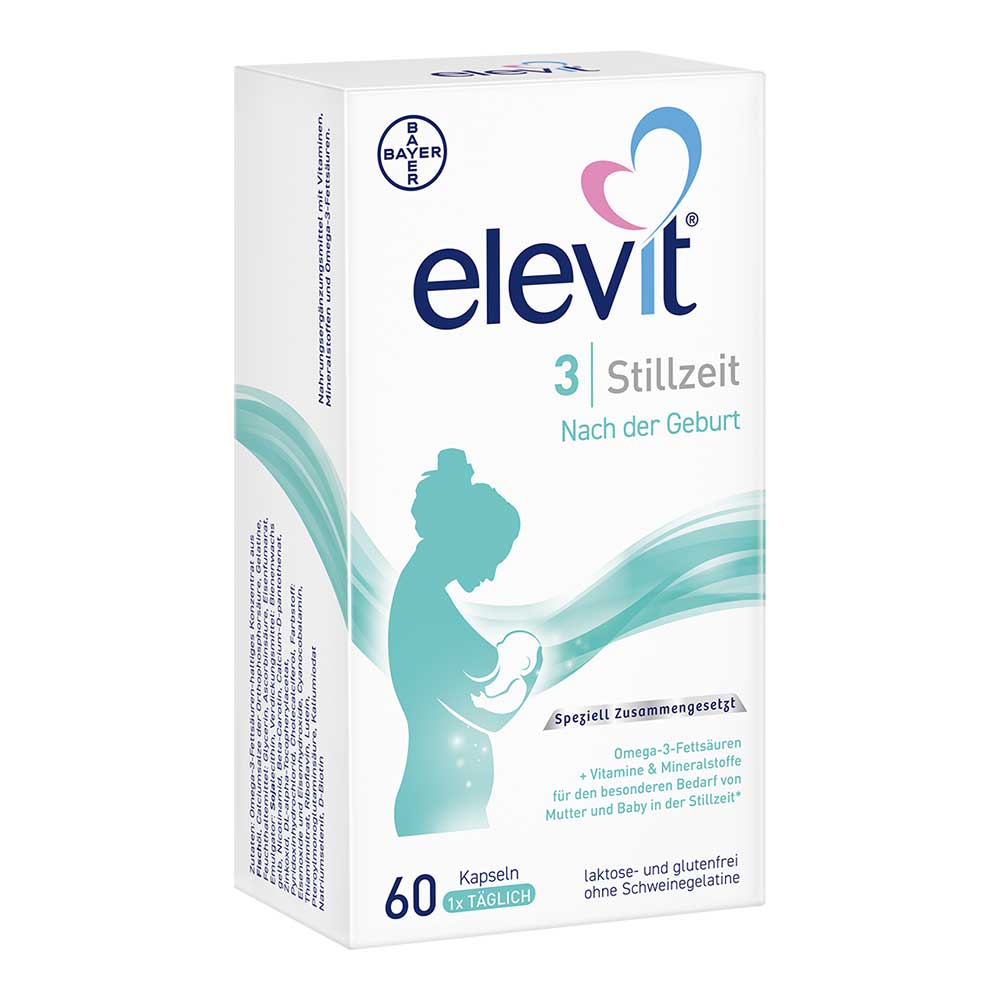 Um während der Stillzeit umfangreich versorgt zu sein, ist nur eine Kapsel täglich nötig. Es empfiehlt sich, Elevit 3 während der gesamten Stillzeit anzuwenden. Neben einer ausgewogenen und abwechslungsreichen Ernährung sowie einer gesunden Lebensweise stellt Elevit 3 eine sinnvolle Ergänzung dar, um den erhöhten Nährstoffbedarf zu decken.