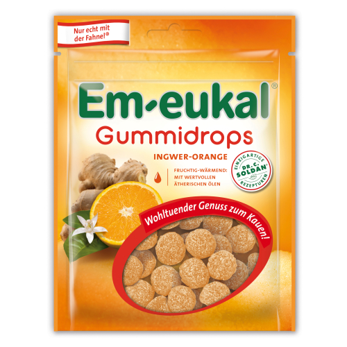 Wohltuendes, extralanges Kauvergnügen! Die einzigartige Geheimrezeptur von Em-eukal gibt es nun auch zum Kauen. Zu fruchtig-wärmenden Sinnesfreuden verführen Em-eukal Gummidrops Ingwer-Orange: Die Schärfe des Ingwers harmoniert perfekt mit der Frische sonnengereifter Orangen. Von unseren Bonbonmachern zubereitet mit wertvollen ätherischen Ölen und in bekannter Dr. C. SOLDAN-Premiumqualität.