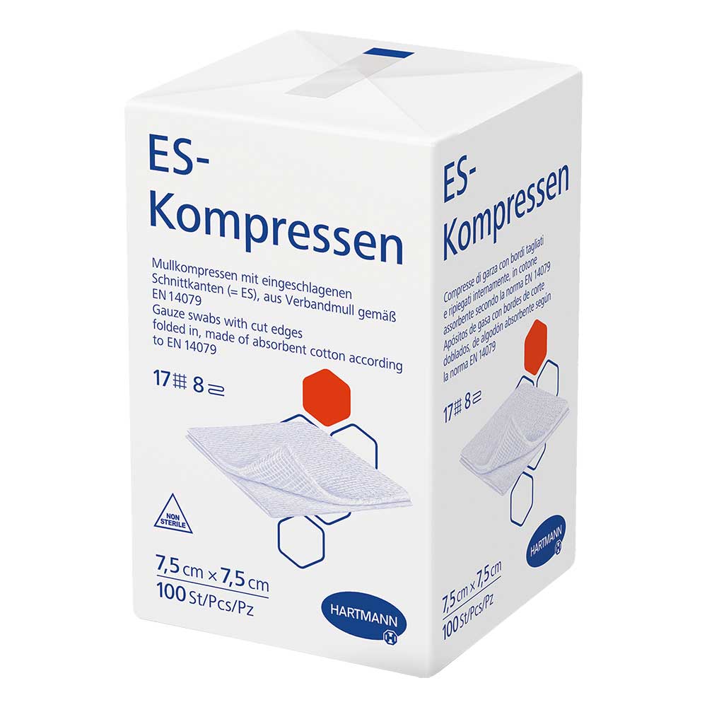 Sie bestehen aus Verbandmull EN 14079, 17fädig und verfügen über eingeschlagene Schnittkanten (= ES).