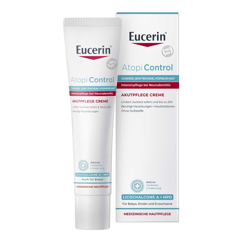 Die Eucerin AtopiControl Akutpflege Creme wurde speziell für zur Neurodermitis Behandlung entwickelt. Sie lindert bei akuten Schubphasen wirksam den Juckreiz, Hautentzündung sowie Spannungsgefühl und beruhigt die Haut. Die Creme kann so oft wie nötig zur Hautpflege auf die betroffenen Hautstellen aufgetragen werden, um Linderung zu verschaffen.