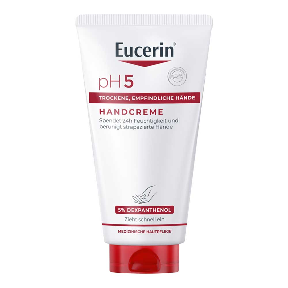 Häufiges Waschen, Temperaturwechsel und Umweltbelastungen sind nur einige der Grunde, die im Alltag empfindliche und trockene Haut verursachen. Eucerin® pH5 Hautschutz Handcreme wurde speziell entwickelt, um diesen Reizen durch einen bis zu 18-stündigen Schutz vor Austrocknung entgegenzuwirken. Die Formel enthält Dexpanthenol, einen Wirkstoff, der bekannt dafür ist, die Hautregeneration anzuregen und die natürliche Schutzfunktion der Haut Tag für Tag zu stärken. Die Formel hilft, den optimalen pH-Wert der Haut wiederherzustellen, Feuchtigkeitsverlust zu reduzieren und die Haut vor Reizungen zu schützen. Für samtig-weiche Haut nach Bedarf auftragen.