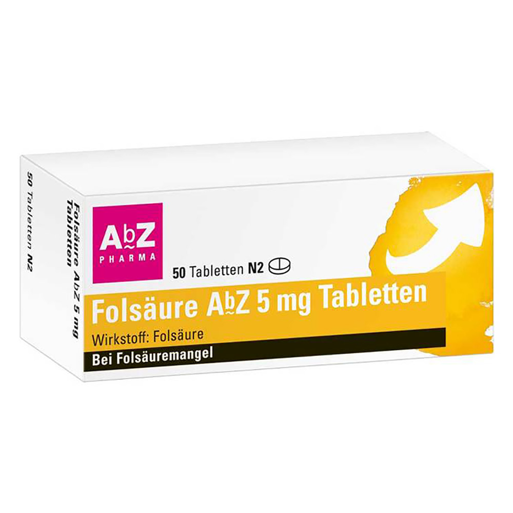Folsäure AbZ 5 mg Tabletten Wirkstoff: Folsäure. Anwendungsgebiete: Behandlung von Folsäuremangelzuständen, die diätetisch nicht behoben werden können. Warnhinweis: Tabletten enth. Lactose! Apothekenpflichtig. Zu Risiken und Nebenwirkungen lesen Sie die Packungsbeilage und fragen Sie Ihre Ärztin, Ihren Arzt oder in Ihrer Apotheke. 9/16