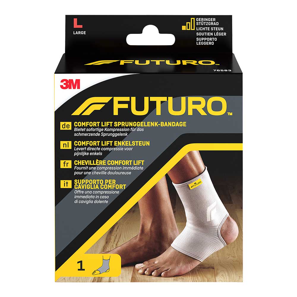 Die FUTURO™ Comfort Lift Sprunggelenk-Bandage stützt schwache oder verletzte Sprunggelenke zuverlässig. Ihr Sprunggelenk erhält so die nötige gezielte Aufmerksamkeit und lässt Sie in Bewegung bleiben. Die praktische Stützbandage aus elastischem Gestrick lässt sich zum An- und Ablegen leicht über den Fuß ziehen. Die atmungsaktive, komprimierende Bandage passt in die meisten Schuhe und bietet bequemen, langen Tragekomfort. Ob zur ganztägigen Unterstützung oder auf dem Tennisplatz und im Fitnessstudio – mit der FUTURO™ Comfort Lift Sprunggelenk-Bandage bleiben Sie auf den Beinen und im Spiel.