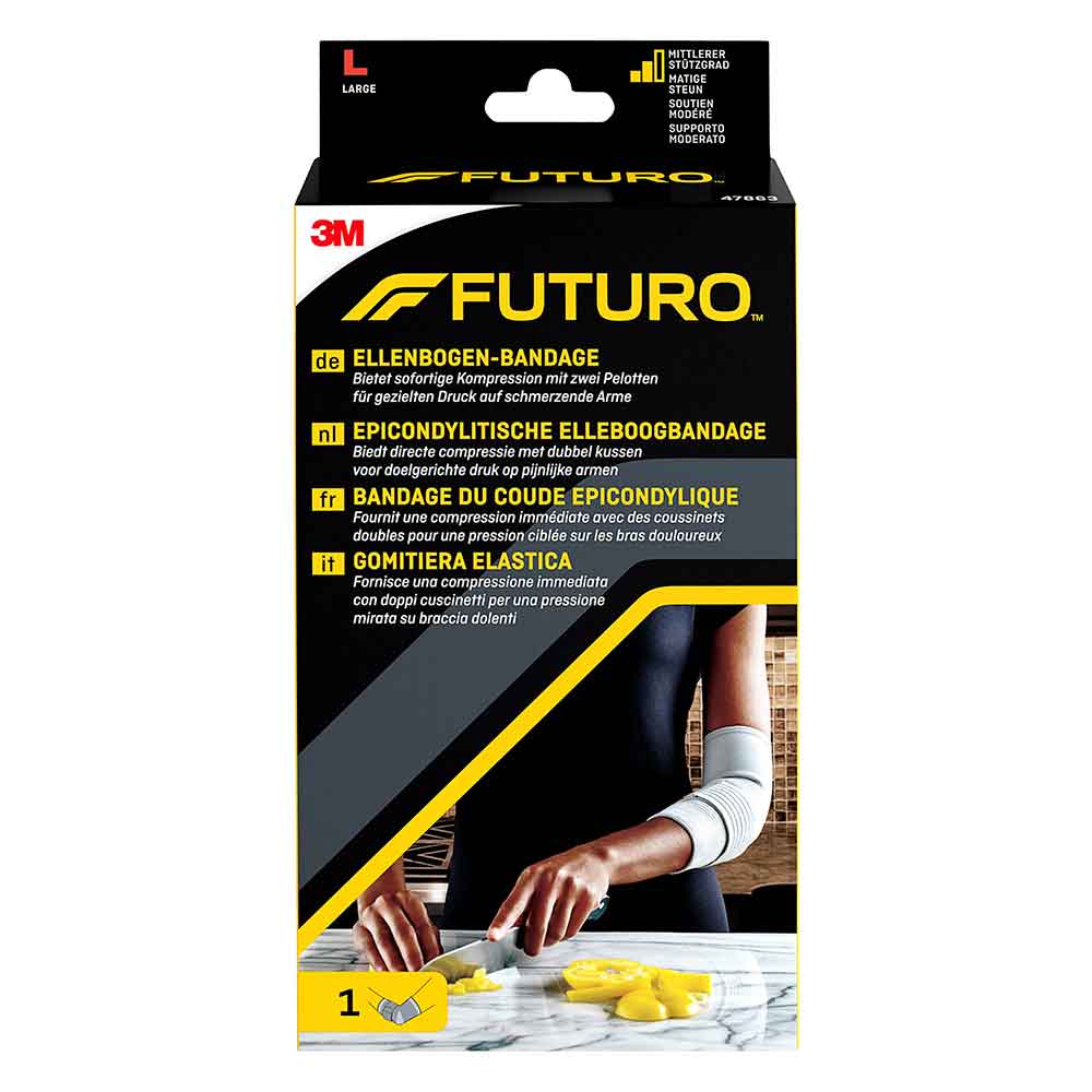 Die FUTURO™ Ellenbogen-Bandage übt mit strategisch platzierten Pelotten gezielten Druck auf Ihre verletzten Sehnen aus. Die komfortable Ellenbogen-Bandage aus elastischer Maschenware ist flach und flexibel, sorgt für natürliche Bewegungsfreiheit und trägt unter der Kleidung nicht auf. Atmungsaktive Eigenschaften sorgen für angenehme Kühle, und das Ärmeldesign ermöglicht müheloses An- und Ausziehen. Gehen Sie Ihren Tätigkeiten wie gewohnt nach – auf die Unterstützung der FUTURO™ Ellenbogen-Bandage mit Pelotten können Sie sich dabei verlassen.