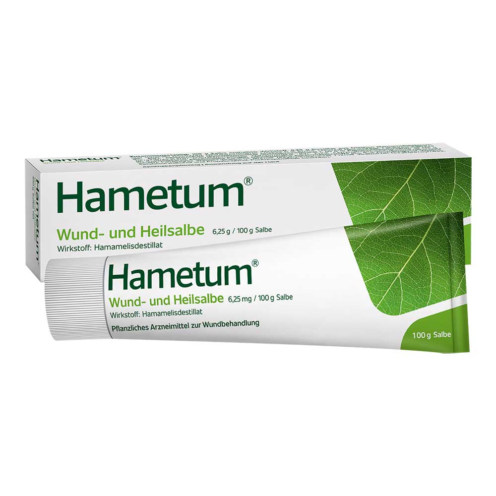 Hametum® Wund- und Heilsalbe. Wirkstoff: Hamamelisdestillat. Anwendungsgebiete: Leichte Hautverletzungen, kleinflächige Entzündungen der Haut und Schleimhäute. Bei großflächigen oder eitrig infizierten Wunden ist die Rücksprache mit einem Arzt erforderlich. Zu Risiken und Nebenwirkungen lesen Sie die Packungsbeilage und fragen Sie Ihre Ärztin, Ihren Arzt oder in Ihrer Apotheke. Dr. Willmar Schwabe GmbH & Co. KG - Karlsruhe