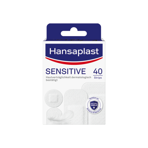 Schützen Sie Ihre Wunde mit dem hypoallergenem Sensitive Pflaster oder einem sterilen Wundverband von Hansaplast.
