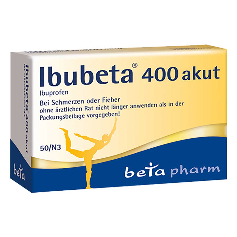 Ibubeta® 400 akut Filmtabletten Wirkstoff: Ibuprofen. Anw.: Leichte bis mäßig starke Schmerzen, wie Kopfschmerzen, Zahnschmerzen, Regelschmerzen und Fieber. Warnh.: Bei Schmerzen oder Fieber ohne ärztlichen Rat nicht länger anwenden als in der Packungsbeilage vorgegeben. Zu Risiken und Nebenwirkungen lesen Sie die Packungsbeilage und fragen Sie Ihre Ärztin, Ihren Arzt oder in Ihrer Apotheke. betapharm Arzneimittel GmbH, 86156 Augsburg. www.betapharm.de