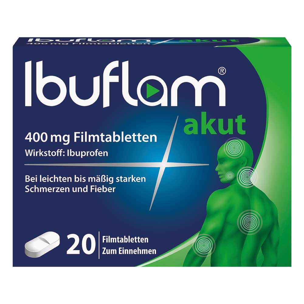 Ibuflam® akut 400 mg Filmtabletten. Wirkstoff: Ibuprofen. Anwendungsgebiet: Leichte bis mäßig starke Schmerzen, Fieber bei Erwachsenen und Kindern über 20 kg (6 Jahren). Warnhinweis: Bei Schmerzen oder Fieber ohne ärztlichen Rat nicht länger anwenden als in der Packungsbeilage vorgegeben! Enthält Lactose. Packungsbeilage beachten! Zu Risiken und Nebenwirkungen lesen Sie die Packungsbeilage und fragen Sie Ihre Ärztin, Ihren Arzt oder in Ihrer Apotheke. A. Nattermann & Cie. GmbH, Brüningstraße 50, 65929 Frankfurt am Main. Stand: Juli 2022. MAT-DE-2103647