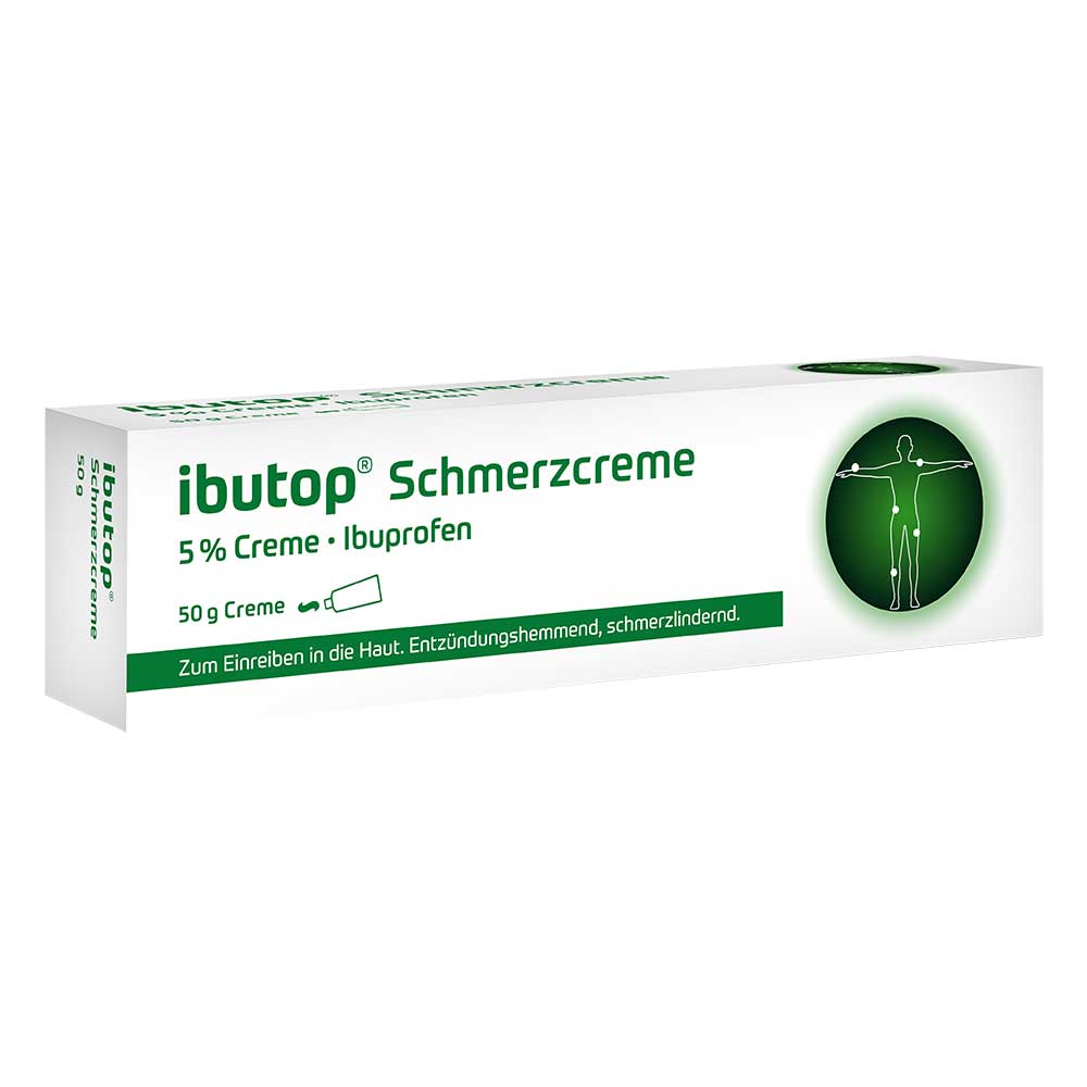 ibutop® Schmerzcreme 5% Creme. Wirkstoff: Ibuprofen. Anwendungsgebiete: Schmerzlinderndes und entzündungshemmendes Arzneimittel zum Einreiben in die Haut. Zur alleinigen oder unterstützenden Behandlung bei Muskelrheumatismus, degenerativen schmerzhaften Gelenkerkrankungen (Arthrosen), entzündlichen rheumatischen Erkrankungen der Gelenke und der Wirbelsäule, Schwellung bzw. Entzündung der gelenknahen Weichteile (z. B. Schleimbeutel, Sehnen, Sehnenscheiden, Bänder und Gelenkkapsel), Schultersteife, Kreuzschmerzen, Hexenschuss, Sport- und Unfallverletzungen wie Prellungen, Verstauchungen, Zerrungen. Enthält Paraben (E219) und Propylenglycol (E1520). Packungsbeilage beachten. Zu Risiken und Nebenwirkungen lesen Sie die Packungsbeilage und fragen Sie Ihre Ärztin, Ihren Arzt oder in Ihrer Apotheke. axicorp Pharma GmbH, 61381 Friedrichsdorf. Stand: Januar 2024