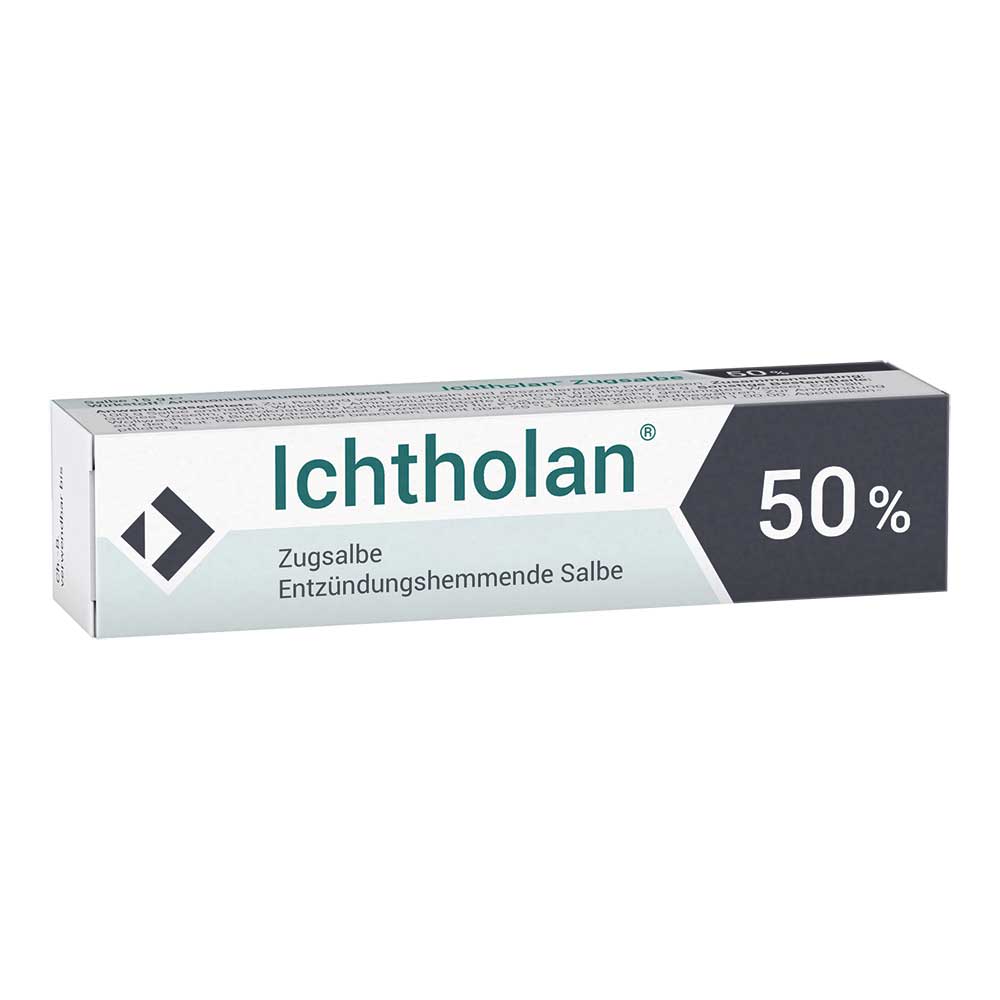 Wirkstoff: Ammoniumbituminosulfonat. Anwendungsgebiete: Ichtholan® Zugsalbe 10 %: Zur Behandlung einer oberflächlichen entzündlichen Erkrankung der Haut, z. B. Rasierpickel. Ichtholan® Zugsalbe 20 %: Zur Reifung von Furunkeln und oberflächlich abszedierenden Prozessen, z. B. Nagelbett-, Haarbalg-, Schweißdrüsen-Entzündungen, Entzündungen durch Splitter und Dornen. Ichtholan® Zugsalbe 50 %: Zur Reifung von Furunkeln und abszedierenden Prozessen, z. B. Hautabszessen, Nagelbett-, Haarbalg-, Schweißdrüsen-Entzündungen, Entzündungen durch Splitter und Dornen. Salben enthalten Wollwachs und Butylhydroxytoluol. Zu Risiken und Nebenwirkungen lesen Sie die Packungsbeilage und fragen Sie Ihre Ärztin, Ihren Arzt oder in Ihrer Apotheke. Ichthyol-Gesellschaft Cordes, Hermanni & Co. (GmbH & Co.) KG, 22335 Hamburg