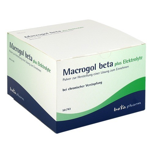 Macrogol beta plus Elektrolyte Pulver zur Herstellung einer Lösung zum Einnehmen. Anw.: Z. Behandlung v. chron. Verstopfung. Warnhinw.: Dieses Arzneimittel enthält 188 mg Natrium (Hauptbestandteil von Kochsalz/Speisesalz) pro Beutel. Dies entspr. 9,4 % der für einen Erwachs. empfohl. max. tägl. Natriumaufnahme mit der Nahrung. Die max. empfohl. Tagesdosis dieses Arzneimittels enth. 564 mg Natrium (Hauptbestandteil von Kochsalz/Speisesalz). Dies entspr. 28 % der für einen Erwachs. empfohl. max. tägl. Natriumaufnahme mit der Nahrung. Sprechen Sie mit Ihrem Arzt oder Apotheker, wenn Sie über einen längeren Zeitraum 3 Beutel tägl. benötigen, insbesondere, wenn Sie eine kochsalzarme (natriumarme) Diät einhalten sollen. Dieses Arzneimittel enth. 0,8 mg Sorbitol pro Beutel. Zu Risiken und Nebenwirkungen lesen Sie die Packungsbeilage und fragen Sie Ihre Ärztin, Ihren Arzt oder in Ihrer Apotheke. betapharm Arzneimittel GmbH, Augsburg