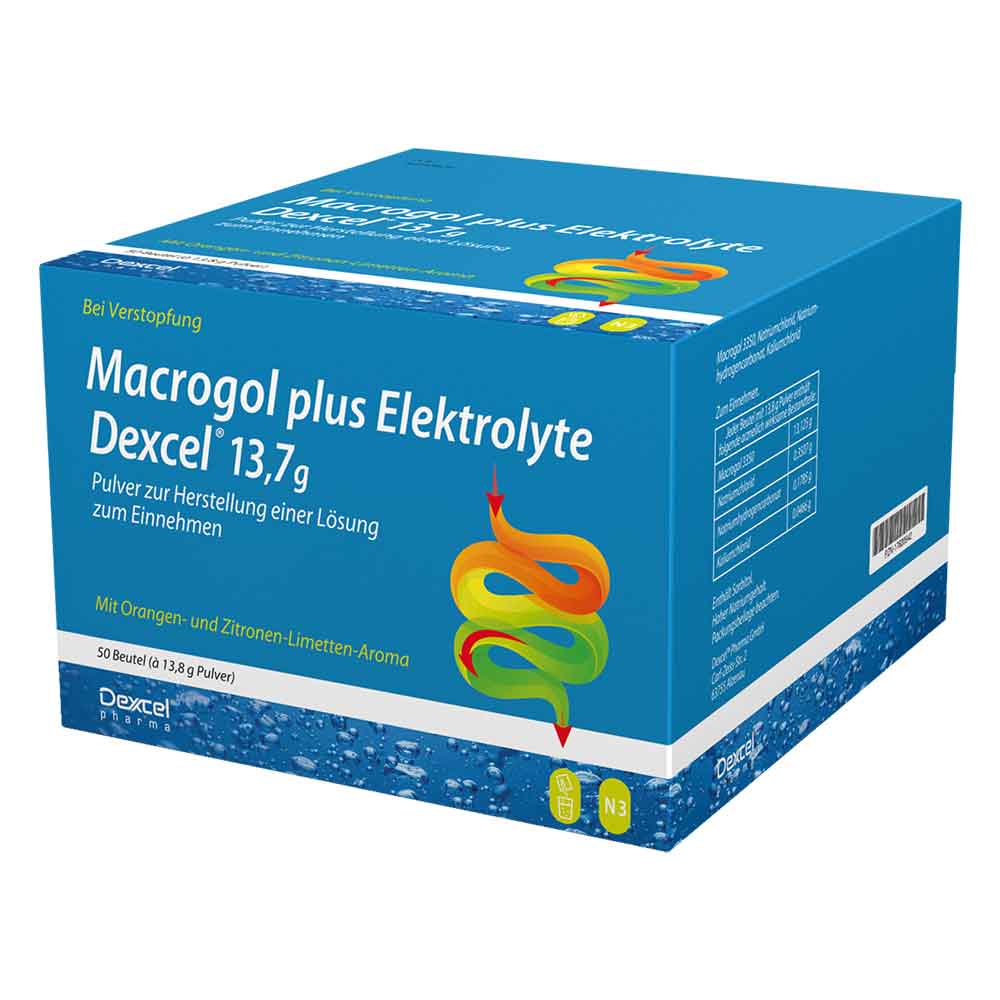 Macrogol plus Elektrolyte Dexcel® 13,7 g Pulver zur Herstellung einer Lösung zum Einnehmen Wirkstoffe: Macrogol 3350, Natriumchlorid, Natriumhydrogencarbonat, Kaliumchlorid Anwendungsgebiete: chronische Verstopfung bei Erwachsenen und Kindern ab 12 Jahren. Hinweis: Hoher Natriumgehalt. Enthält Sorbitol und Kalium. Zu Risiken und Nebenwirkungen lesen Sie die Packungsbeilage und fragen Sie Ihre Ärztin, Ihren Arzt oder in Ihrer Apotheke. Dexcel® Pharma GmbH, 63755 Alzenau Stand: November 2022