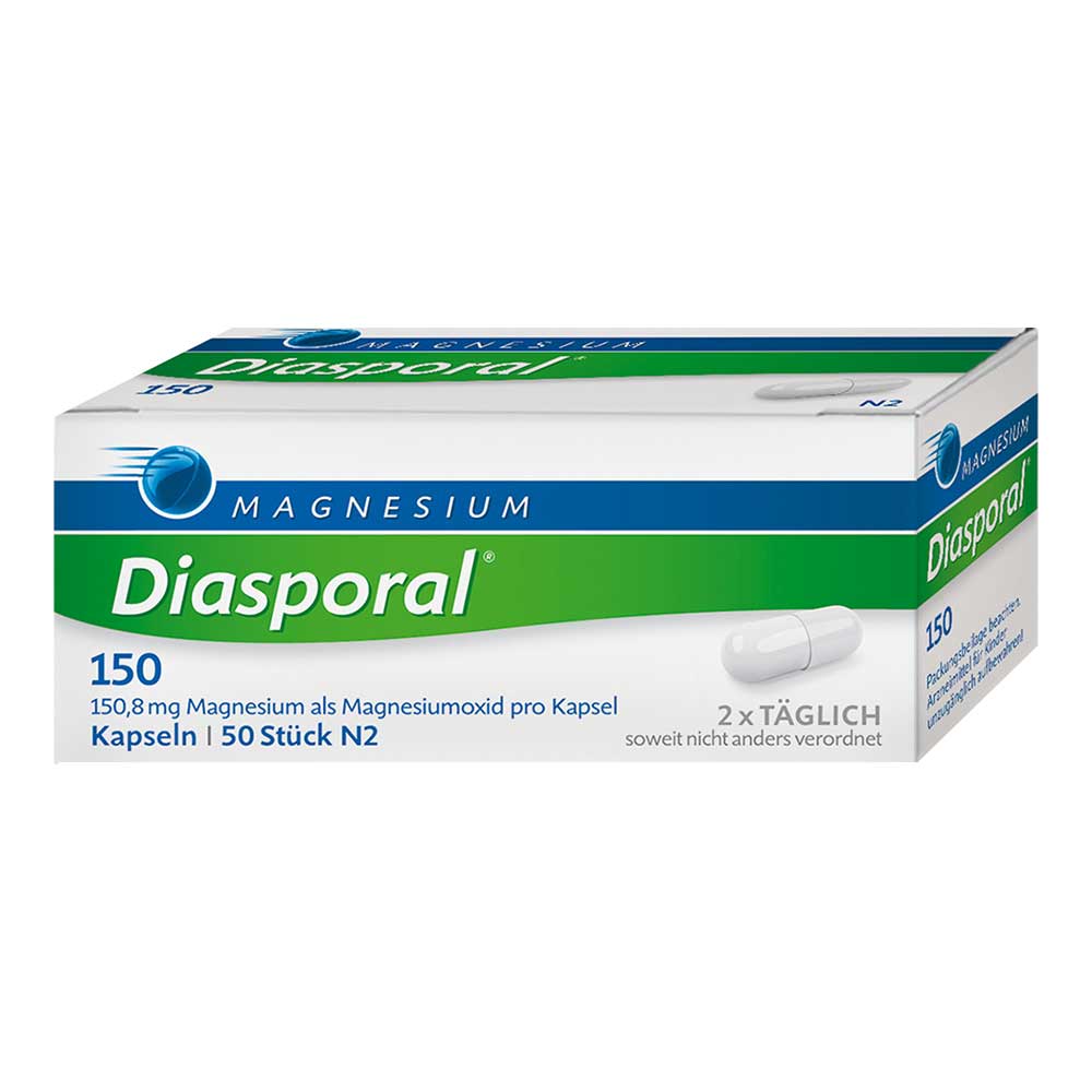 MAGNESIUM Diasporal® 150 Kapseln. (Wirkstoff: Magnesiumoxid) Anwendungsgebiet: Magnesiummangel, wenn er Ursache für Störungen der Muskeltätigkeit (Neuromuskuläre Störungen, Wadenkrämpfe) ist. Zu Risiken und Nebenwirkungen lesen Sie die Packungsbeilage und fragen Sie Ihre Ärztin, Ihren Arzt oder in Ihrer Apotheke. Protina Pharm. GmbH, D-85737 D-Ismaning