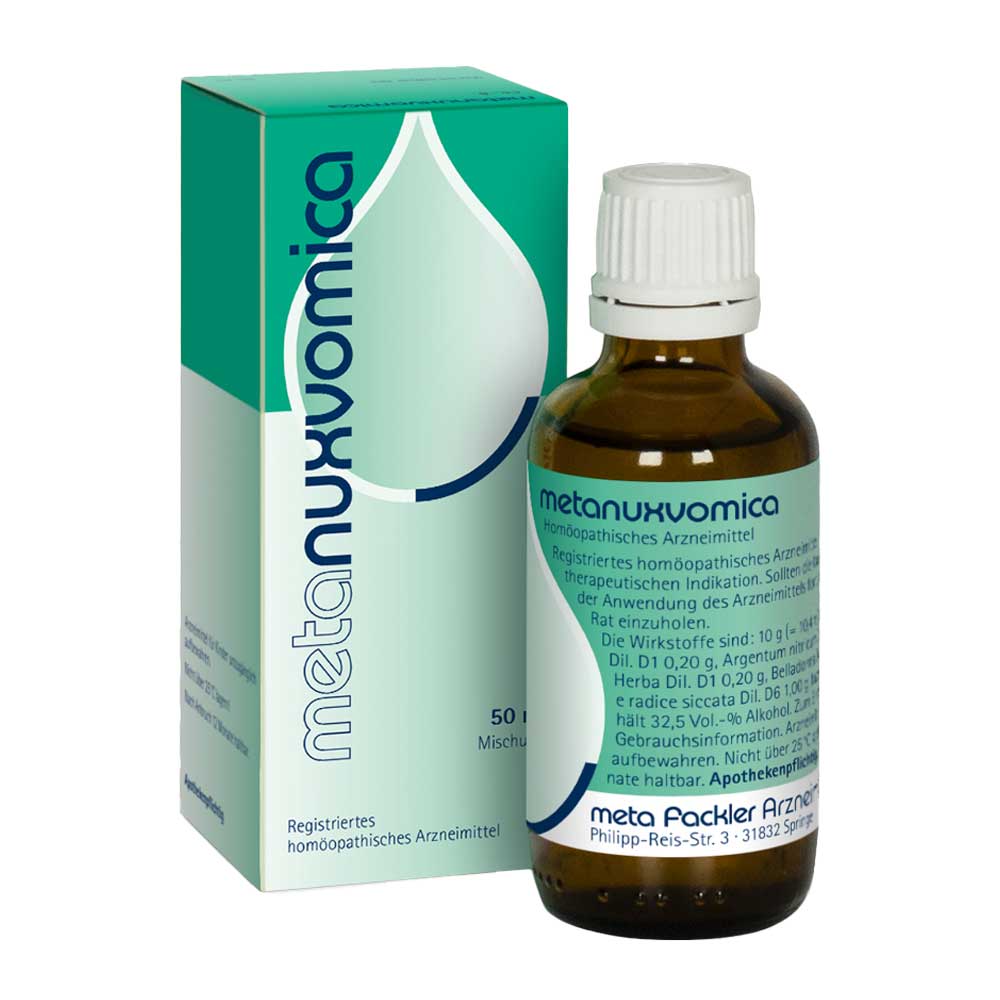 metanuxvomica Mischung.Anwendungsgebiete: Registriertes homöopathisches Arzneimittel, daher ohne Angabe einer therapeutischen Indikation. Enthält 37 mg Alkohol (Ethanol) pro 5 Tropfen, entsprechend 32,5 Vol.-%. Zu Risiken und Nebenwirkungen lesen Sie die Packungsbeilage und fragen Sie Ihre Ärztin, Ihren Arzt oder in Ihrer Apotheke. meta Fackler Arzneimittel GmbH, D-31832 Springe.