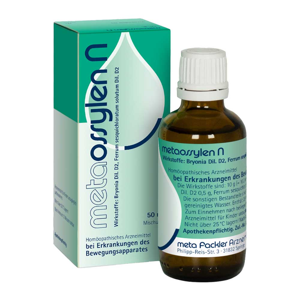 metaossylen N Mischung. Wirkstoffe: Bryonia Dil. D2, Ferrum sesquichloratum solutum Dil. D2 Die Anwendungsgebiete leiten sich von den homöopathischen Arzneimittelbildern ab. Dazu gehören: Akuter und chronischer Rheumatismus mit schmerzhafter Schulter. Hinweis: Bei akuten Gelenkbeschwerden, die z. B. mit Rötung, Schwellung oder Überwärmung einhergehen sowie bei anhaltenden, unklaren oder neu auftretenden Beschwerden sollte ein Arzt aufgesucht werden. Enthält 53 mg Alkohol (Ethanol) pro 10 Tropfen, entsprechen 20 Vol.-%. Zu Risiken und Nebenwirkungen lesen Sie die Packungsbeilage und fragen Sie Ihre Ärztin, Ihren Arzt oder in Ihrer Apotheke. meta Fackler Arzneimittel GmbH, D-31832 Springe.