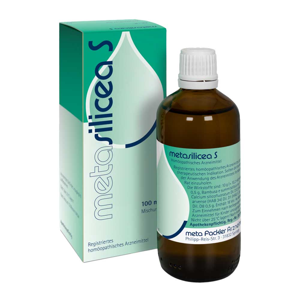 metasilicea S Mischung.Anwendungsgebiete: Registriertes homöopathisches Arzneimittel, daher ohne Angabe einer therapeutischen Indikation. Enthält 25 mg Alkohol (Ethanol) pro 5 Tropfen, entsprechend 18 Vol.-%. Zu Risiken und Nebenwirkungen lesen Sie die Packungsbeilage und fragen Sie Ihre Ärztin, Ihren Arzt oder in Ihrer Apotheke. meta Fackler Arzneimittel GmbH, D-31832 Springe.
