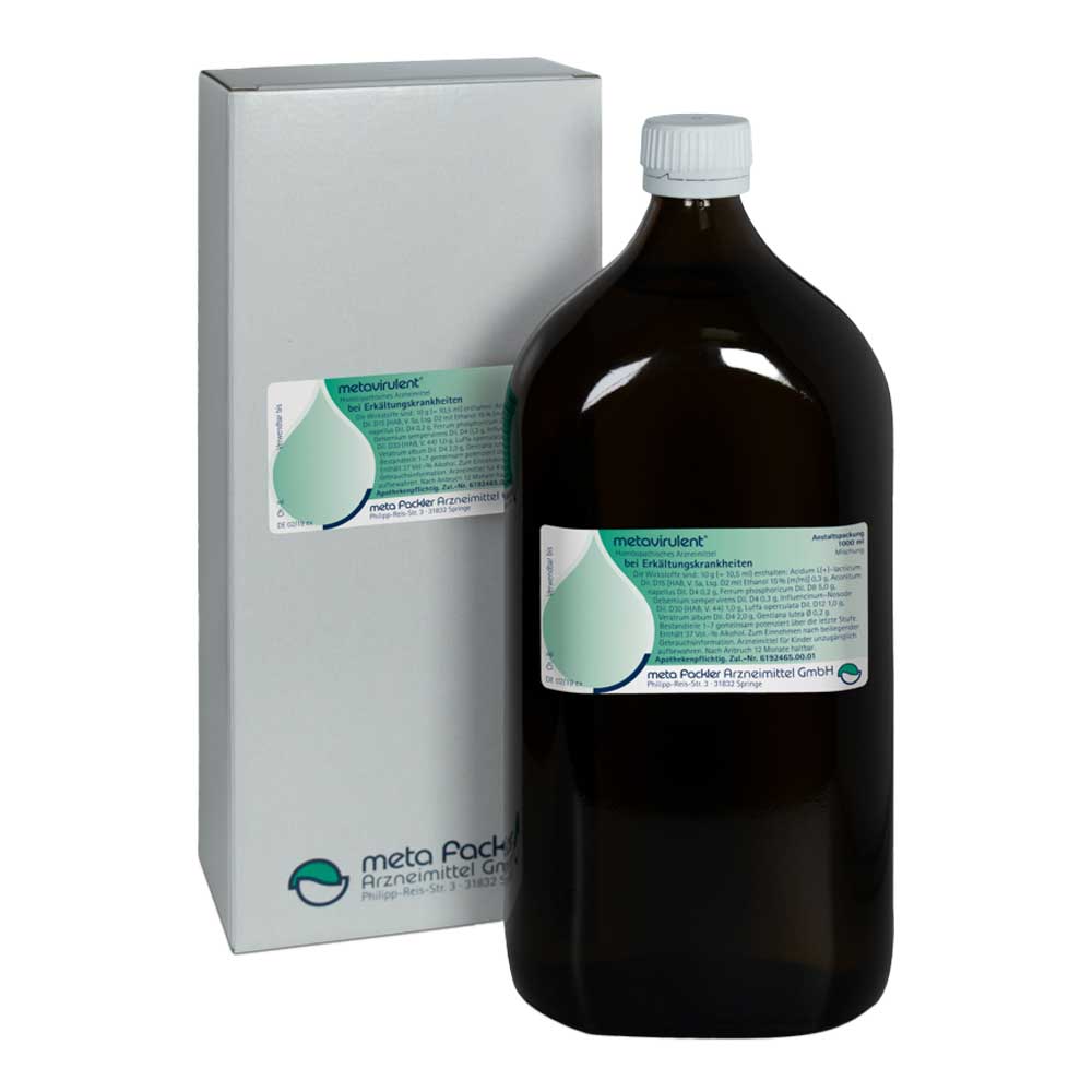 metavirulent® Mischung. Die Anwendungsgebiete leiten sich von den homöopathischen Arzneimittelbildern ab. Dazu gehören: grippale Infekte. Hinweis: Bei Fieber, das länger als 3 Tage anhält oder über 39 °C ansteigt, sollte ein Arzt aufgesucht werden. Enthält 80 mg Alkohol (Ethanol) pro 10 Tropfen, entsprechend 37 Vol.-%. Zu Risiken und Nebenwirkungen lesen Sie die Packungsbeilage und fragen Sie Ihre Ärztin, Ihren Arzt oder in Ihrer Apotheke. meta Fackler Arzneimittel GmbH, 31832 Springe. (05/24)