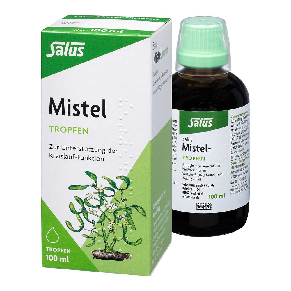 Salus Mistel-Tropfen Wirkstoff: 1,02 g Mistelkraut-Auszug / 1 ml. Anwendungsgebiet: Traditionelles pflanzliches Arzneimittel zur Unterstützung der Kreislauf-Funktion ausschließlich auf Grund langjähriger Anwendung. Enthält 24 Vol.-% Alkohol und Schwefeldioxid. Bitte Packungsbeilage beachten. Zu Risiken und Nebenwirkungen lesen Sie die Packungsbeilage und fragen Sie Ihre Ärztin, Ihren Arzt oder in Ihrer Apotheke.