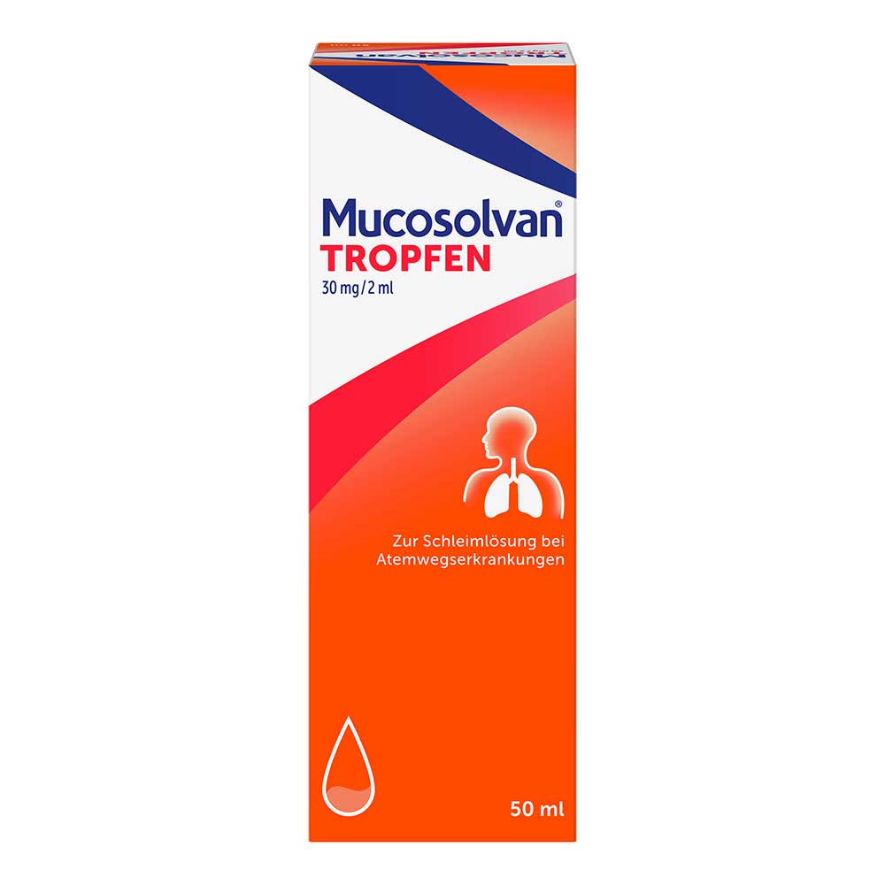 Mucosolvan® Tropfen 30 mg/2 ml.Wirkstoff: Ambroxolhydrochlorid. Anwendungsgebiet: Zur Schleim lösenden Behandlung bei akuten und chronischen Erkrankungen der Bronchien und der Lunge mit zähem Schleim. Warnhinweis: Enthält Sorbitol und Benzoesäure. Apothekenpflichtig. Zu Risiken und Nebenwirkungen lesen Sie die Packungsbeilage und fragen Sie Ihre Ärztin, Ihren Arzt oder in Ihrer Apotheke. A. Nattermann & Cie. GmbH, Brüningstraße 50, 65929 Frankfurt am Main. Stand: Juli 2022