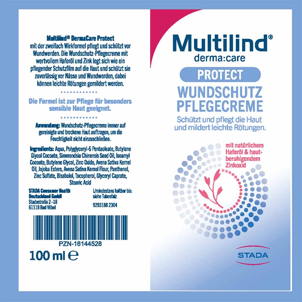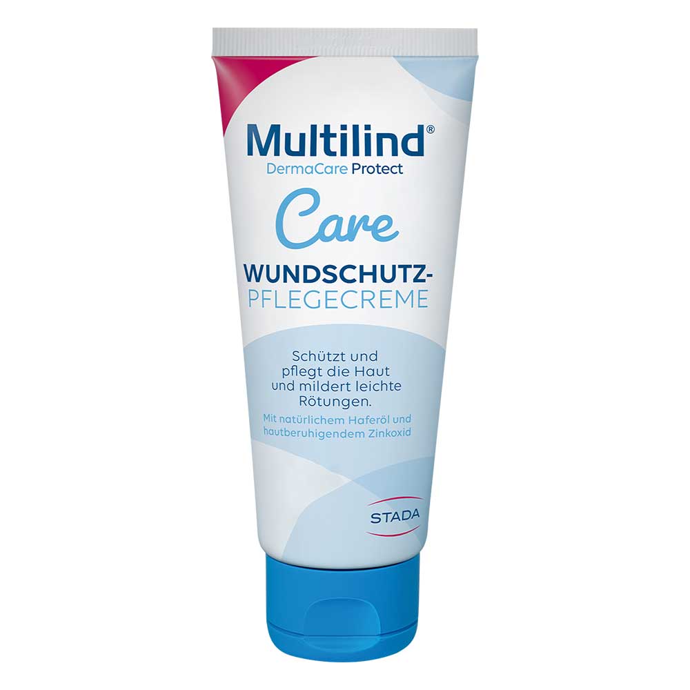 Die Wundschutz-Pflegecreme Multilind® DermaCare Protect mit der 2-fach Schutzformel legt sich wie ein pflegender Film auf die gestresste Haut und schu¨tzt im Windelbereich zuverlässig vor Nässe und Wundwerden und mildert leichte Rötungen.