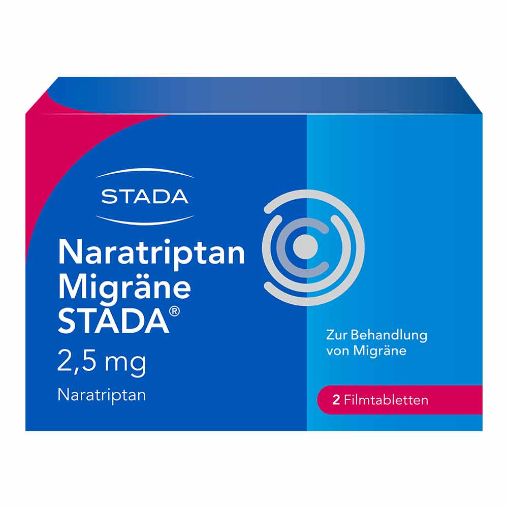 Naratriptan Migräne STADA® 2,5 mg Filmtabletten. Wirkstoff: Naratriptan. Zur Behandlung von Migräne. Enthält Lactose und entölte Phospholipide aus Sojabohnen. Zu Risiken und Nebenwirkungen lesen Sie die Packungsbeilage und fragen Sie Ihre Ärztin, Ihren Arzt oder in Ihrer Apotheke. STADA Consumer Health Deutschland GmbH, Stadastraße 2-18, 61118 Bad Vilbel, Stand: Juli 2020