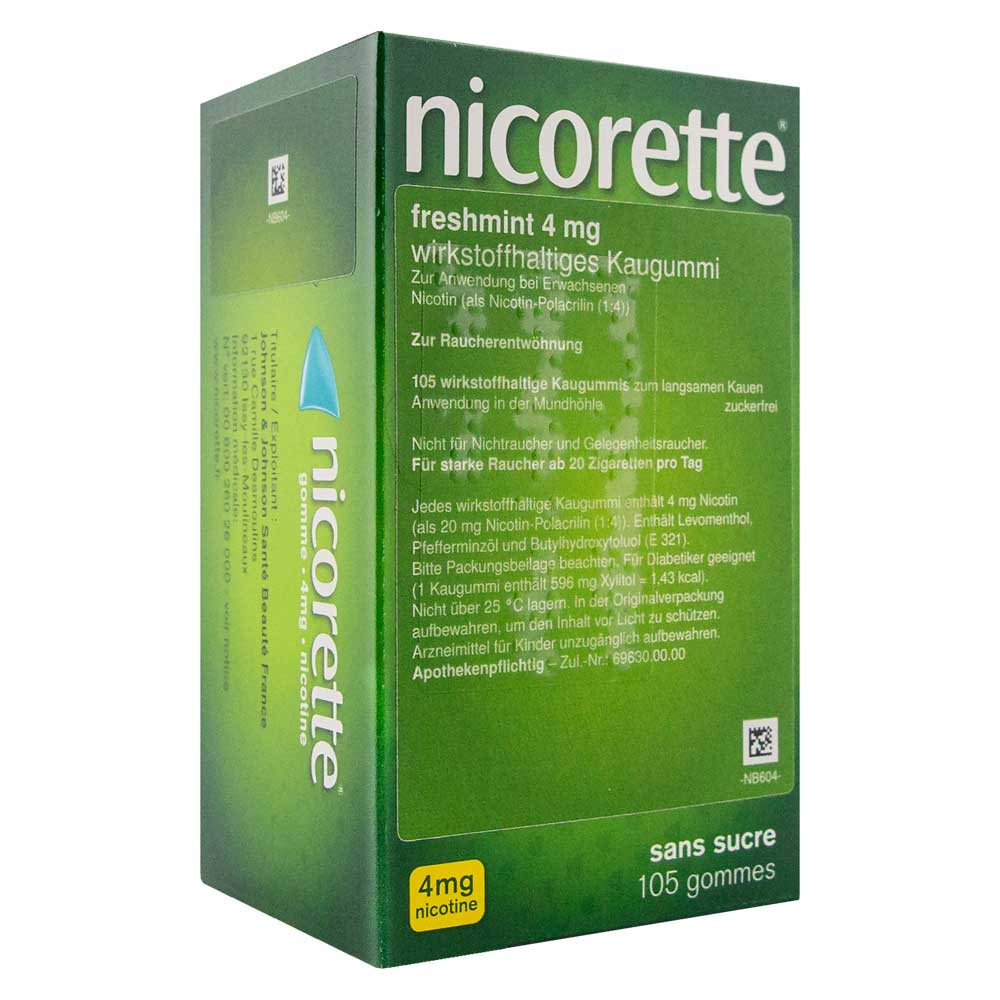 Nicorette® Kaugumm 4 mg freshmint wirkstoffhaltiges Kaugummi. Wirkstoff: Nicotin (als Nicotin-Polacrilin (1:4)). Anwendungsgebiete: Behandlung der Tabakabhängigkeit durch Linderung der Nicotinentzugserscheinungen. Unterstützung der Raucherentwöhnung. Auch zur Verringerung des Zigarettenkonsums (Rauchreduktion), um auf diesem Weg den Rauchausstieg zu erreichen. Warnhinweise: Enthält Levomenthol, Pfefferminzöl, Butylhydroxytoluol (E 321). Stand: 05/2025