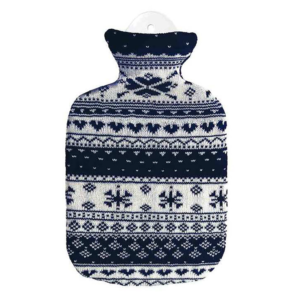 Die hübsche Natur-Gummiwärmflasche verfügt über einen schönen Strickbezug mit Norwegermuster. Die Rückseite unterscheidet sich vom Muster her von der Vorderseite. Beide Seiten sind mit dunkelblau-weißen Akzenten im Norweger-Stil gestrickt. Der Bezug ist mit einem Reißverschluss ausgestattet. Das Material des hübschen Strickbezuges entspricht dem Oeko-Tex Standard 100. Im Lieferumfang ist sowohl der Bezug als auch die 2,0 Liter Gummi-Wärmflasche enthalten.