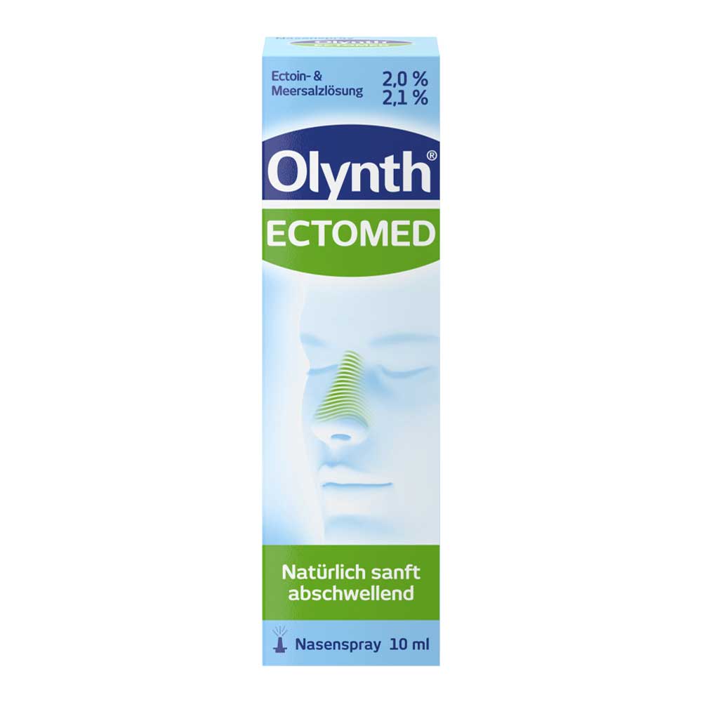 Das sanft abschwellende Nasenspray von Olynth® Ectomed kann zur Behandlung einer verstopften Nase sowie trockener und gereizter Nasenschleimhäute angewendet werden. Es befeuchtet und beruhigt die gereizten Nasenschleimhäute. Die hypertone Lösung hilft, die Nase sanft abzuschwellen, da das Produkt mit seinem osmotischen Effekt einen Ausgleich der überschüssigen Flüssigkeit in der Nasenschleimhaut bewirkt. Der Naturstoff Ectoin® bildet einen luftdurchlässigen Hydrofilm auf der Nasenschleimhaut und hilft sie so zu beruhigen und zu befeuchten und die körpereigene Schutzbarriere zu unterstützen.