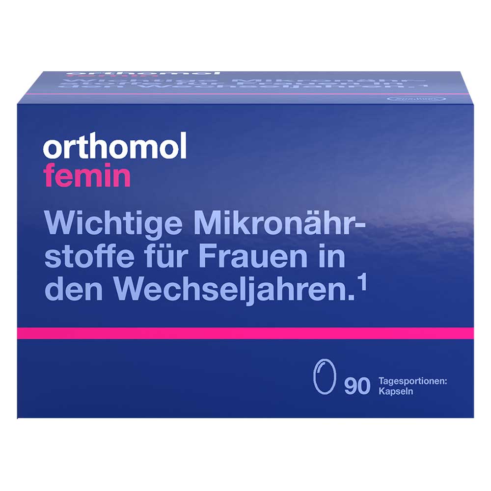 Orthomol Femin ist ein Nahrungsergänzungsmittel für Frauen in den Wechseljahren. Wichtige Nährstoffe für Haut, Haare und Nägel. Mit Biotin zum Erhalt normaler Haut und Haare sowie Selen zum Erhalt normaler Nägel. Mit Isoflavonen aus Soja und Lignanen aus Leinsamen, wichtigen Fettsäuren und Coenzym Q10.