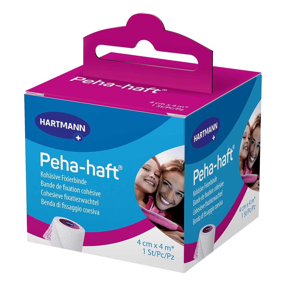Peha-haft von Hartmann ist eine kohäsive (selbsthaftende), elastische Fixierbinde. Sie eignet sich für Fixierverbände aller Art, insbesondere auch an Gelenken und konischen Körperteilen. Zusätzliches Fixiermaterial wird dank des Zweifachen-Hafteffektes nicht benötigt.