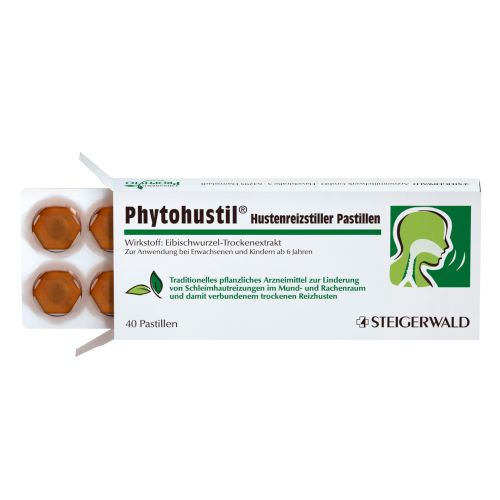 Phytohustil® Hustenreizstiller Pastillen. Wirkstoff: Eibischwurzel-Trockenextrakt. Traditionelles pflanzliches Arzneimittel zur Linderung von Schleimhautreizungen im Mund- und Rachenraum und damit verbundenem trockenen Reizhusten. Ausschließlich auf Grund langjähriger Anwendung für das Anwendungsgebiet registriert. Bei fortdauernden Krankheitssymptomen oder beim Auftreten anderer als der in der Packungsbeilage erwähnten Nebenwirkungen sollte der Anwender einen Arzt oder eine andere in einem Heilberuf tätige qualifizierte Person konsultieren. Enthält Maltitol/Isomaltitol/Maltitol-Lösung und Sorbitol. Packungsbeilage beachten. Stand: 09/2019. Bayer Vital GmbH, Kaiser-Wilhelm-Allee 70, 51373 Leverkusen, Deutschland.
