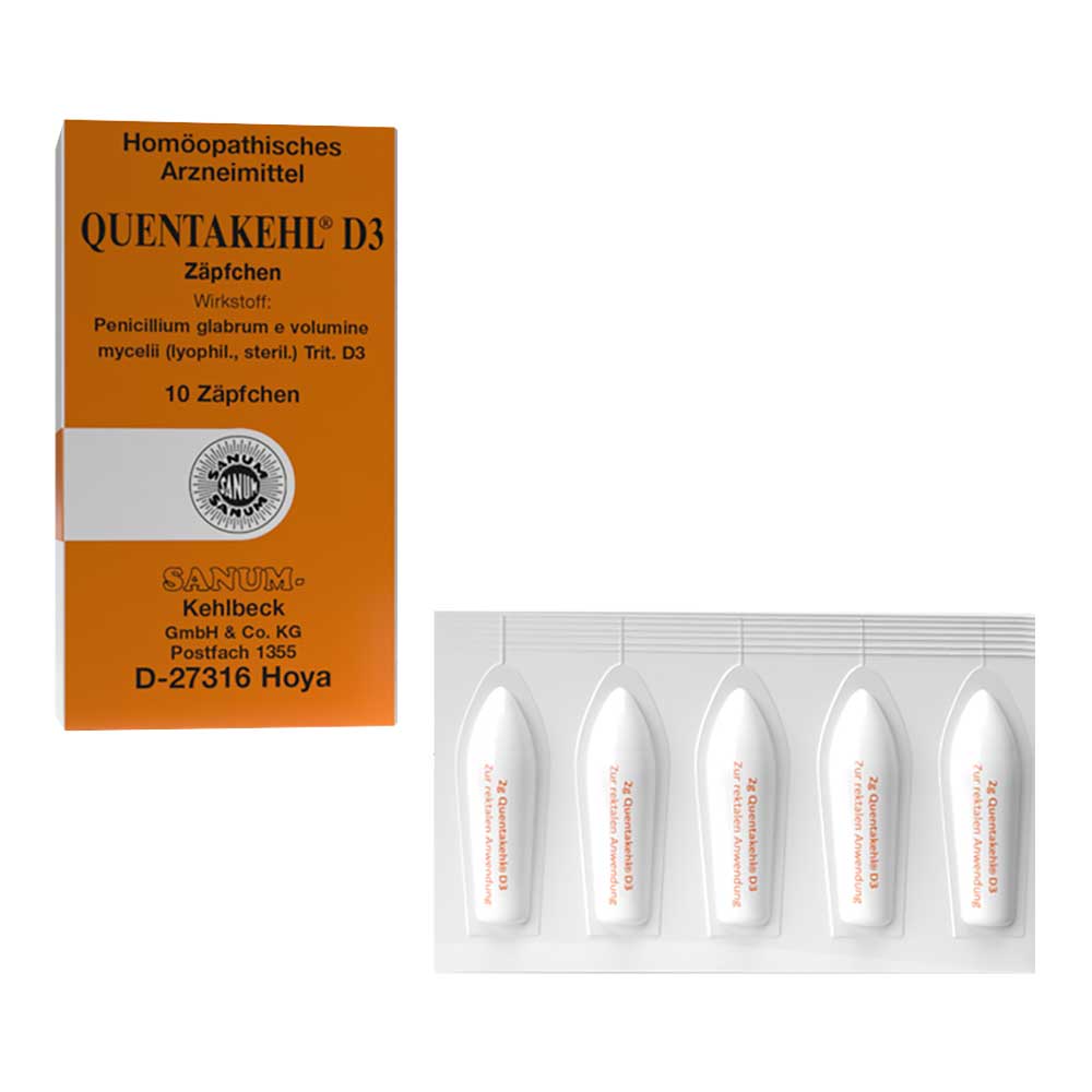 QUENTAKEHL ® D3 - Zäpfchen. Zusammensetzung: 1 Zäpfchen enthält: Wirkstoff: 0,2 g Penicillium glabrum e volumine mycelii (lyophil., steril.) Trit. D3 (HAB, Vorschrift 6). Sonstiger Bestandteil: Hartfett. Erfahrungsgemäß unterstützend angewendet bei: Registriertes homöopathisches Arzneimittel, daher ohne Angabe einer therapeutischen Indikation. Gegenanzeigen: Nicht anwenden bei: - bekannter Überempfindlichkeit gegenüber Schimmelpilzen (Penicillium glabrum) - Autoimmunerkrankungen - Kindern unter 12 Jahren - Schwangerschaft und Stillzeit Nebenwirkungen: Aufgrund des Gehaltes von QUENTAKEHL® D3 an spezifischen organischen Bestandteilen können Überempfindlichkeitsreaktionen, hauptsächlich in Form von Hautreaktionen, auftreten und eine Allergie gegen den Bestandteil Penicillium glabrum ausgelöst werden. Das Arzneimittel ist dann abzusetzen und ein Arzt aufzusuchen. Hersteller: SANUM-Kehlbeck GmbH & Co. KG, Postfach 1355, 27316 Hoya.