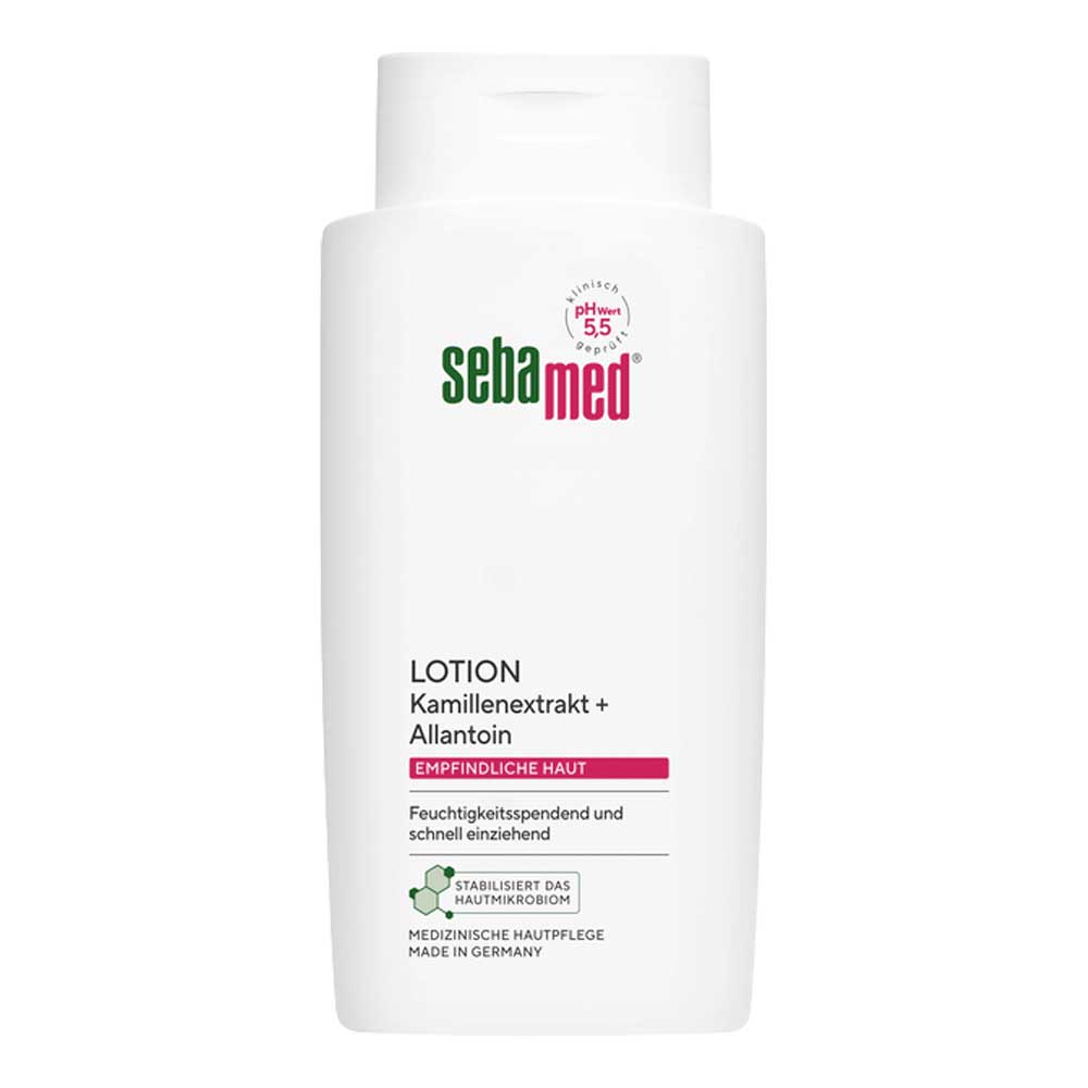 Die Sebamed Lotion eignet sich für empfindliche Haut, fördert die natürliche Feuchtigkeit der Haut und pflegt mit Kamillenextrakt und Allantoin.