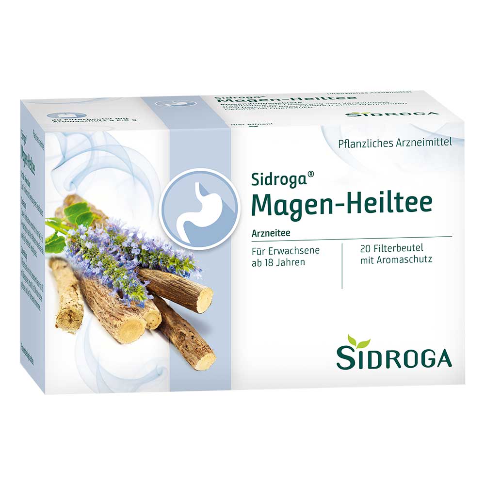 Sidroga Magen-Heiltee: Wirkstoff: Süßholzwurzel. Anwendungsgebiete: pflanzliches Magen-Darm-Mittel bei entzündlichen Erkrankungen im Magen-Darm-Bereich. Zu Risiken und Nebenwirkungen lesen Sie die Packungsbeilage und fragen Sie Ihre Ärztin, Ihren Arzt oder in Ihrer Apotheke. Sidroga GfGmbH, 56119 Bad Ems.