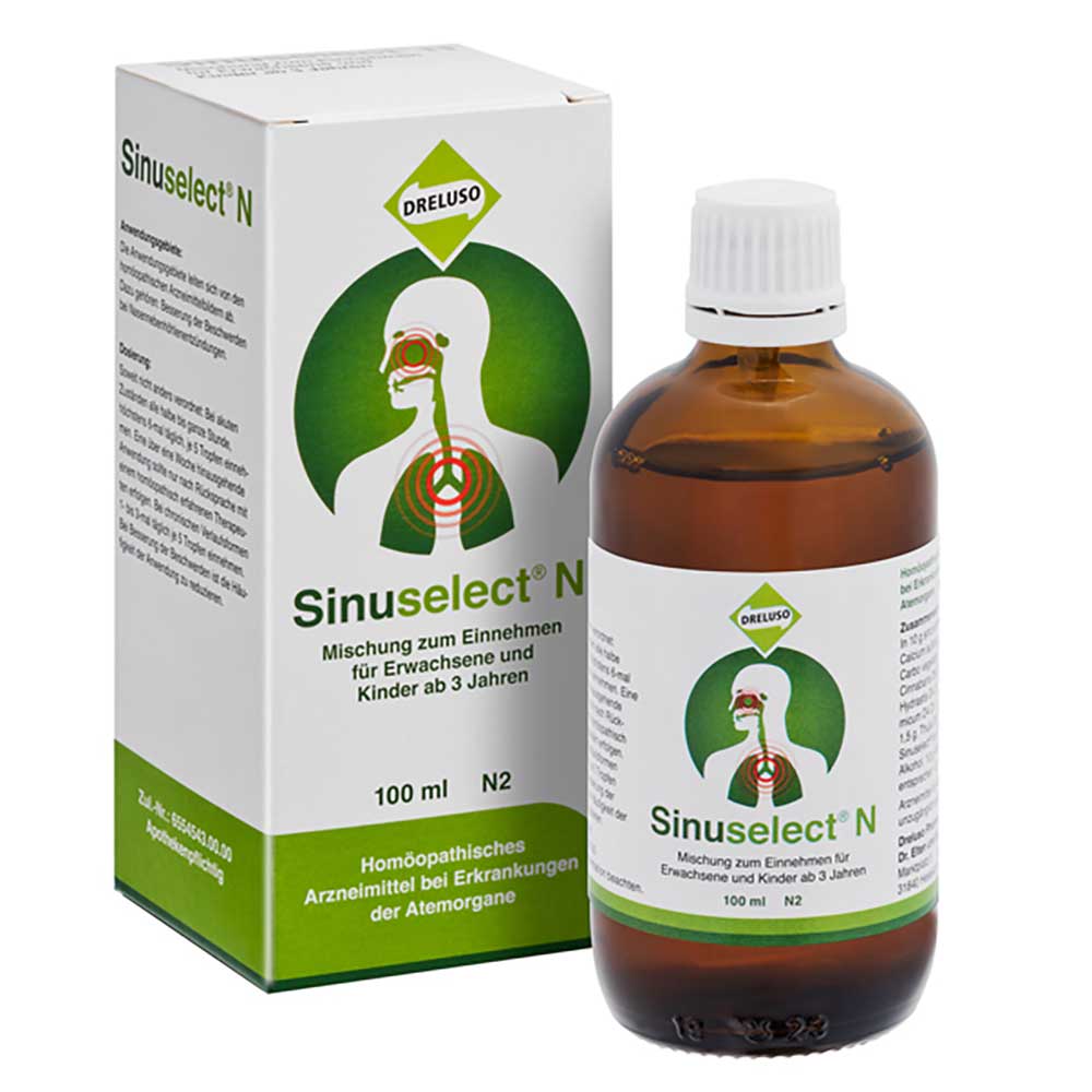 Sinuselect® N Anwendungsgebiete: Die Anwendungsgebiete leiten sich von den homöopathischen Arzneimittelbildern ab. Dazu gehören: Besserung der Beschwerden bei Nasennebenhöhlenentzündung. Zusammensetzung: 10 g enthalten: Calcium sulfuricum D4 dil. 1,5 g, Carbo vegetabilis D8 dil. 1,5 g, Cinnabaris D8 dil. 1,5 g, Hydrastis D4 dil. 1 g, Kalium bichromicum D4 dil. 1,5 g, Silicea D8 dil. 1,5 g, Thuja D8 dil.1,5 g. Enthält 31 Vol.-% Alkohol. Gegenanzeigen: Überempfindlichkeit gegen Chrom. Schwangerschaft und Stillzeit: keine ausreichende Dokumentation. Nebenwirkungen: In Einzelfällen Hautreaktionen, gelegentlich allergische Reaktionen wegen des Bestandteils Cinnabaris. Wechselwirkungen: nicht bekannt Dosierung: Soweit nicht anders verordnet: Bei akuten Zuständen alle halbe bis ganze Stunde, höchstens 6-mal täglich je 5 Tropfen einnehmen. Bei chronischen Verlaufsformen 1- bis 3-mal täglich je 5 Tropfen einnehmen. Zu Risiken und Nebenwirkungen lesen Sie die Packungsbeilage und fragen Sie Ihre Ärztin, Ihren Arzt oder in Ihrer Apotheke.