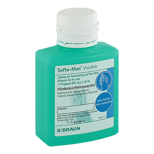 Softa-Man ViscoRub. Zusammensetzung: 100 ml Lösung enthalten: Wirkstoffe: Ethanol (100%) 45 g, 1-Propanol (Ph. Eur.) 18 g Sonstige Bestandteile: Gereinigtes Wasser, Butan-2-on, Glycerol, Isopropylmyristat (Ph. Eur.), (Hexadecyl,octadecyl)[(RS)-2-ethylhexanoat], Octyldodecanol (Ph. Eur.), Edetol, Acrylate (C10-30 Alkylacrylat-Crosspolymer), (+/ )alpha-Bisabolol. Anwendungsgebiete: Hygienische und chirurgische Händedesinfektion. Gegenanzeigen: Überempfindlichkeit (Allergie) gegenüber Ethanol oder 1-Propanol oder einen der sonstigen Bestandteile von Softa-Man ViscoRub. Nebenwirkungen: Kontaktallergie. Hautirritationen wie Rötung und Brennen insbesondere bei häufiger Anwendung. Warnhinweise: Entzündlich. Behälter dicht geschlossen halten. Von Zündquellen fernhalten. - Nicht rauchen! Nicht in die Augen bringen. Nicht auf verletzter Haut oder auf Schleimhäuten anwenden. Nur zur äußerlichen Anwendung. 52,3 Gew.% Ethanol, 20,9 Gew.% 1-Propanol; 21°C Flammpunkt nach DIN 51 755. Stand der Information: 02/2012. Pharmazeutischer Unternehmer: B.Braun Melsungen AG, 34209 Melsungen