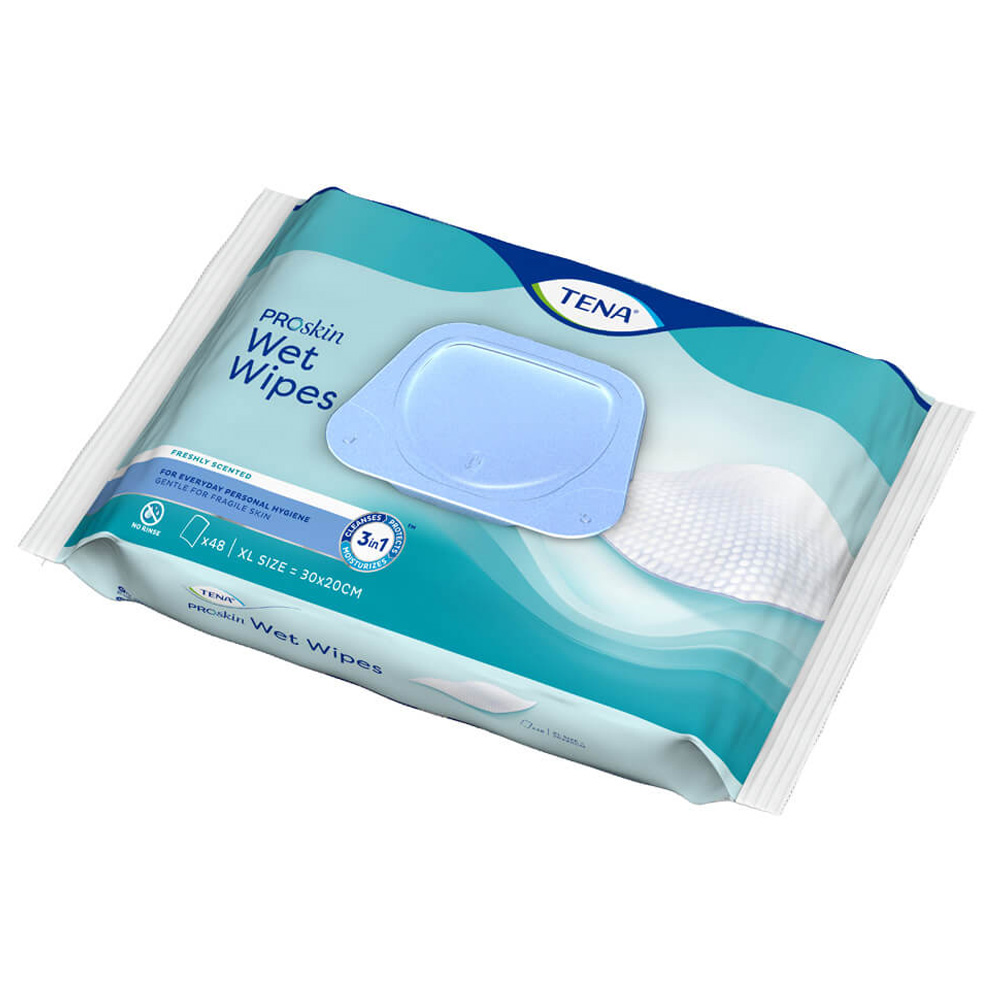 TENA® PROskin Wet Wipes sind vorbefeuchtete Reinigungstücher für Erwachsene, die selbst sehr empfindliche und angegriffene Haut schonend reinigen, schützen und mit Feuchtigkeit versorgen. Die großen Feuchttücher sind zur gründlichen Reinigung intimer Bereiche beim Wechsel von Inkontinenzprodukten oder zur Ganzkörperreinigung sensibler älterer Haut geeignet. Als milde Alternative zu Seife und Wasser unterstützen TENA® PROskin Wet Wipes das Frischegefühl und eine gereinigte Haut, die frei von Gerüchen ist. Die Inhaltsstoffe sind dermatologisch getestet und schonend für die angegriffene Haut.